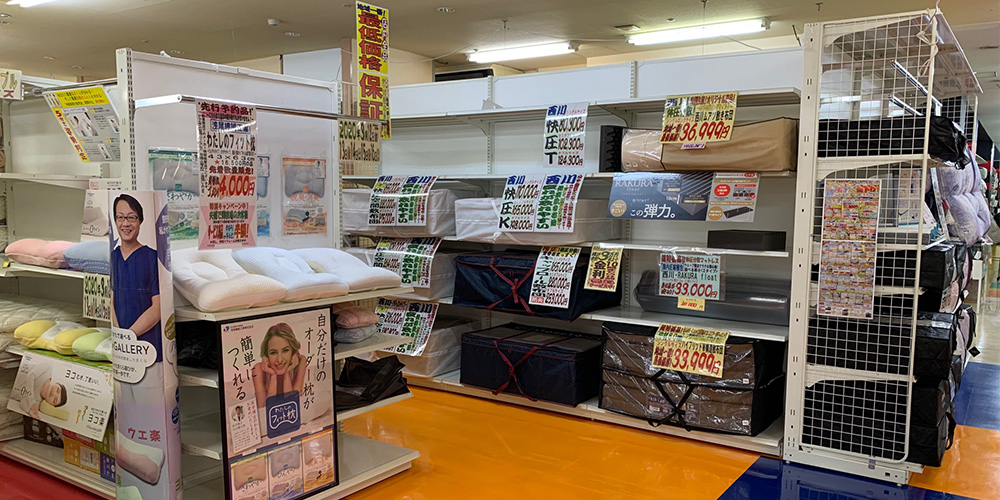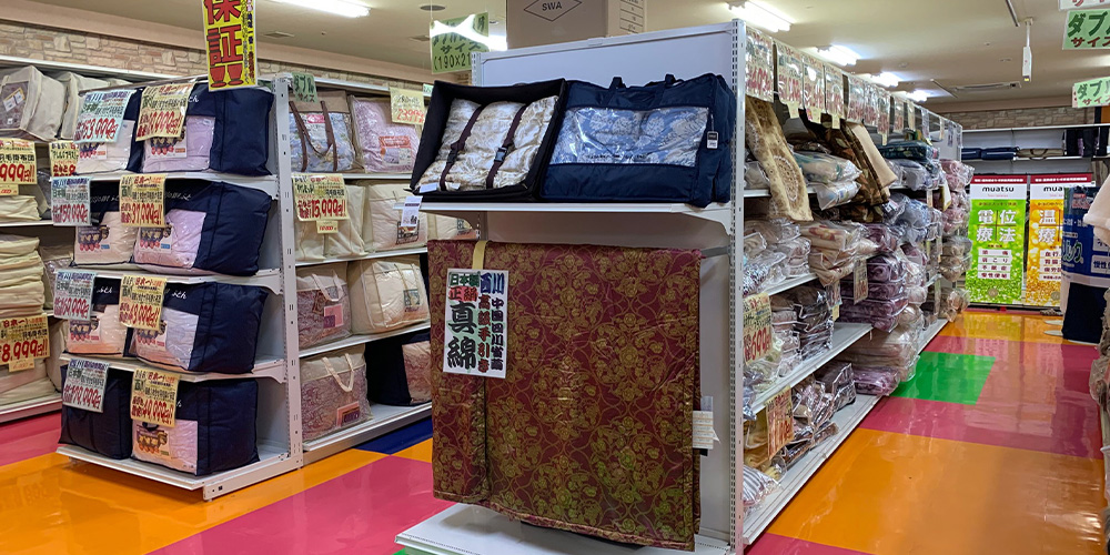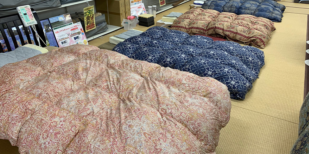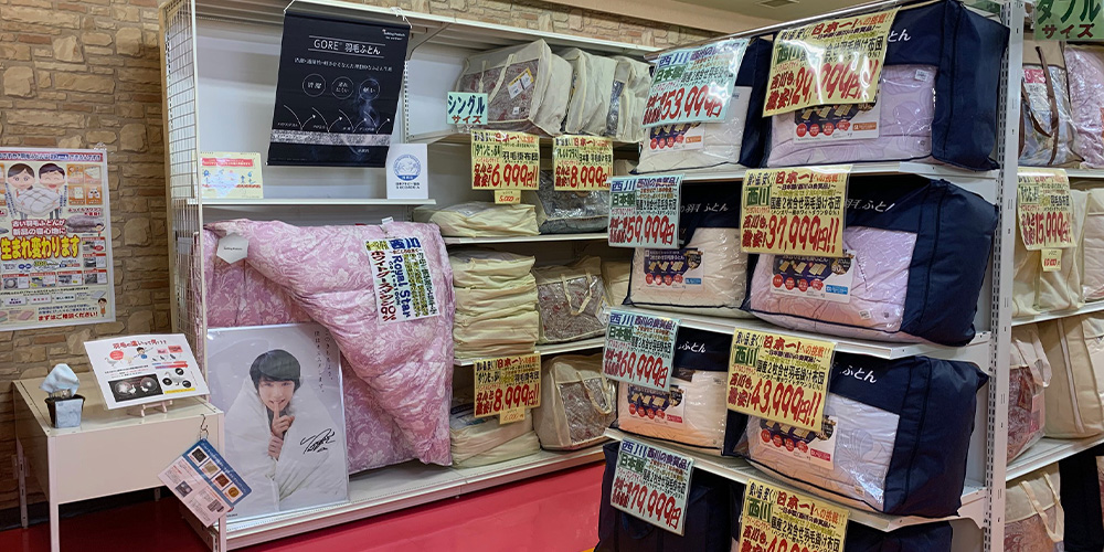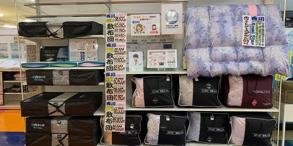 枕や掛布団・敷布団のお試し寝はもちろん、店内商品のほとんどを実際に広げ、触れて頂くことができますので、後から「思ったモノと違った」という失敗をせず、満足のいくお買い物をしていただけます。