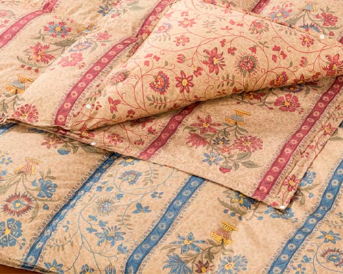 春・秋はボリュームたっぷりのポーランド・マズーリ産スノーグースを贅沢に使用した合掛布団。夏は近江の熟練した職人により作られた手引き真綿(シルク)の肌掛け布団。冬はその2枚を重ねることで極上の眠りをお約束します。